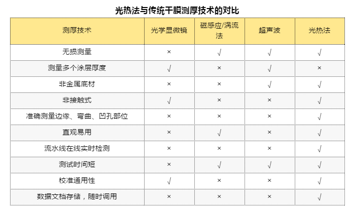 而传统测试湿膜/干膜的方法有很多局限性。以下是光热法与传统测厚方法的对比: