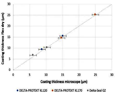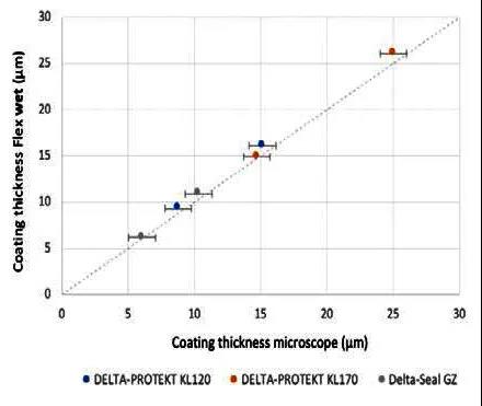 图:比较显微镜法和涂魔师 Flex在干燥状态下测量涂层厚度(上图:涂魔师 Flex测量干膜,下图:涂魔师Flex测量湿膜)。两种测量设备具有很高的相关性(R2 = 0.998)。显微镜测量法的标准误差小于1.5μm,涂魔师Flex的测量标准误差小于0.3μm。