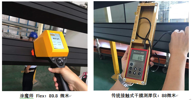 用户使用ATO涂魔师非接触膜厚分析仪后与干膜测厚仪进行对比测试,发现对铝型材上相同位置测试数据接近,且ATO涂魔师非接触膜厚分析仪重复性和精度要更好;